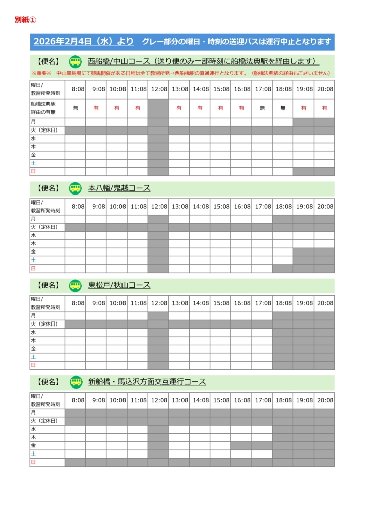 現在運行しております無料送迎バスにつきまして、来る2026年2月4日(水)及び2026年4月1日(水)にルート変更や運休を含む大幅な変更を行いますのでご案内申し上げます。